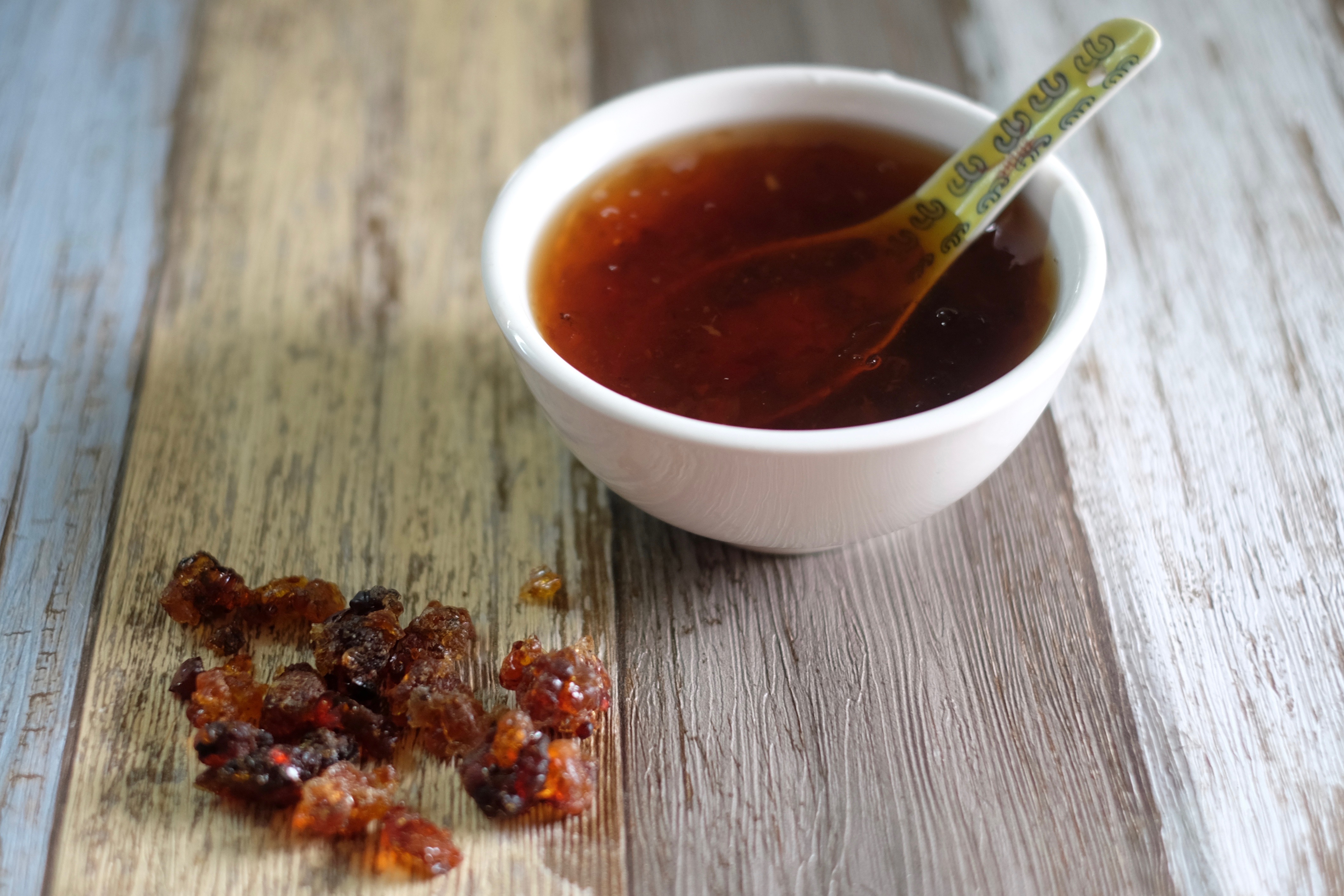 Peach gum is the resin from peach and Chinese wild peach trees, already solidified when it is found. As detailed in classical Chinese medical literature, its curative qualities include solving urinal infections, thirst-quenching and relieving stress.