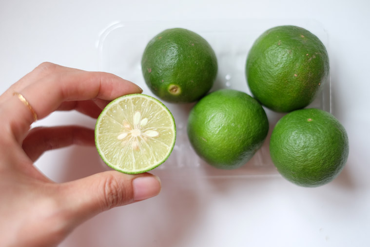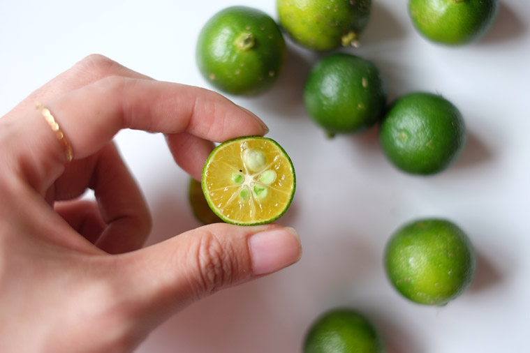 Whereas Calamansi lime (Limau kasturi) is smaller and rounded. It’s also softer hence easier to juice with bare hands. Unlike key lime with light green flesh, calamansi lime’s flesh is golden yellow. It taste less acidic and sweeter than key lime.