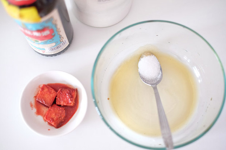 - Step 1 MAKE MARINATE: Pour 3 tbsp of Chinese cooking wine and 1 tbsp of sugar into a container. Add 3 pieces of red beancurd and mash with a spoon. Mix well.