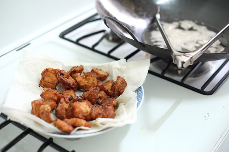 - Step 7 FRY PORK: Pour enough oil in a wok to submerge pork. Turn on the stove to medium. Heat oil until it sizzles. Then deep-fry pork in small batches until it turns golden brown. Transfer to plate.