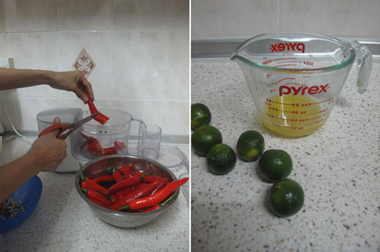 - Step 1 PREP: Squeeze lime juice. Cut and deseed both red chili and bird’s eye chili. Chop tomato into quarters.