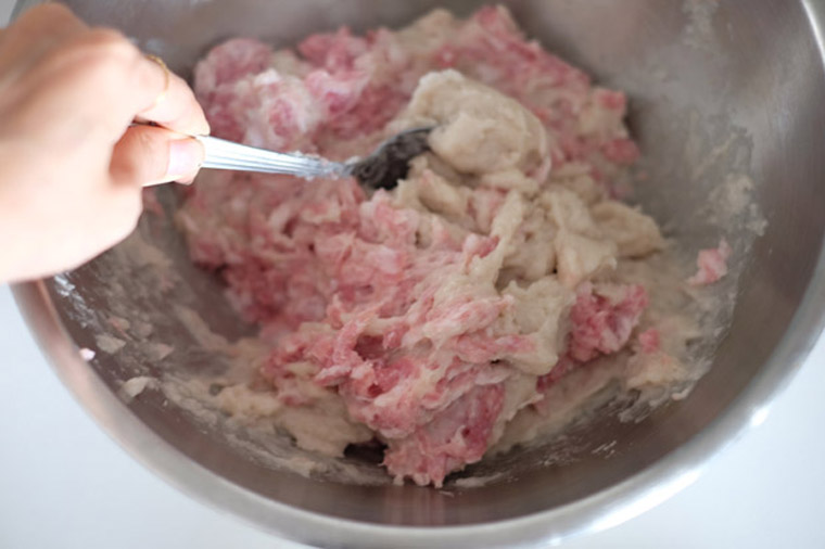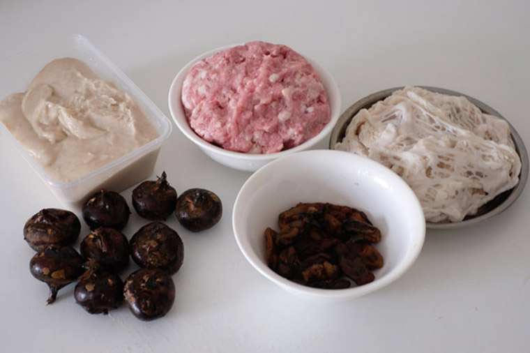 - Step 2 MIX & SEASON MEAT: In a large mixing bowl, toss in minced pork, fish paste, dried oyster and water chestnut. Mix well. Sprinkle salt, sugar and white pepper. Mix well.