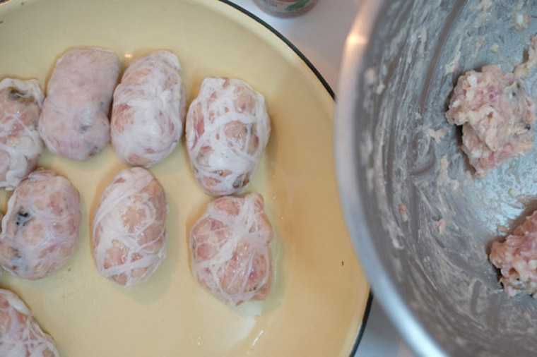 - Step 3 WRAP: Take a spoonful of mixed meat and place onto caul fat. Wrap it tightly