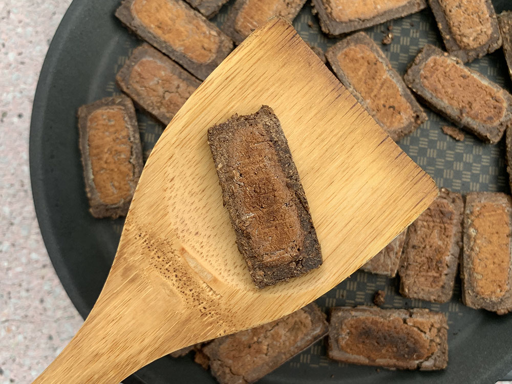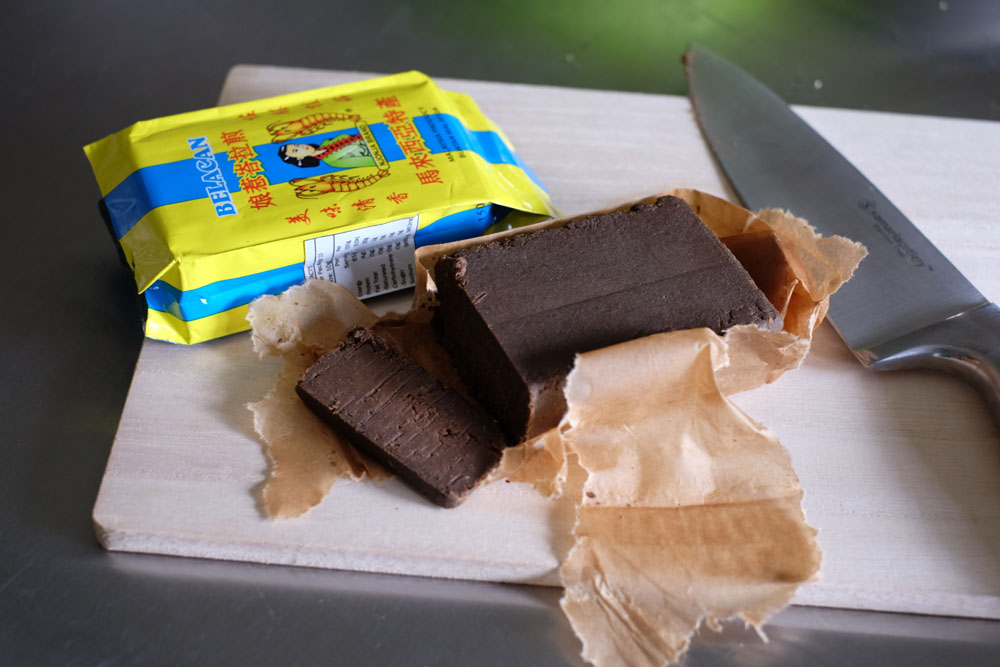 At this stage, belacan is cooked, dry, and easily crumbled. If you like, you can crush it with a spatula to turn it into smaller pieces.