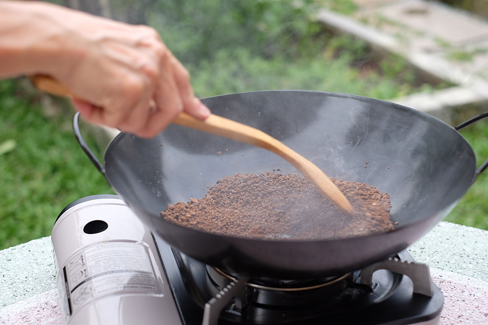 1. Cook in somewhere with good ventilation Belacan has an extremely strong smell in itself. When cooked, it emits an even more pungent smell that Europeans had mistaken for a corpse! (Read: French Neighbour Mistake Grilled Belacan To Be Rotten Corpse). So do make sure the kitchen has good ventilation. As I have a garden and a portable stove, I toast belacan in my garden.