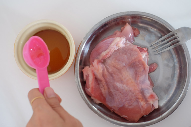 - Step 1 SALT CHICKEN. Rinse chicken. Pat dry with paper towels. Poke holes with a fork on the skin side. Rub chicken with a pinch of salt.