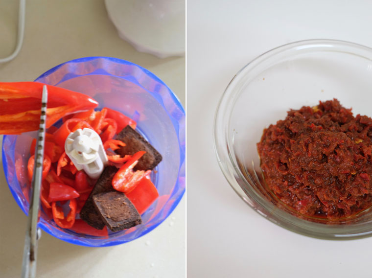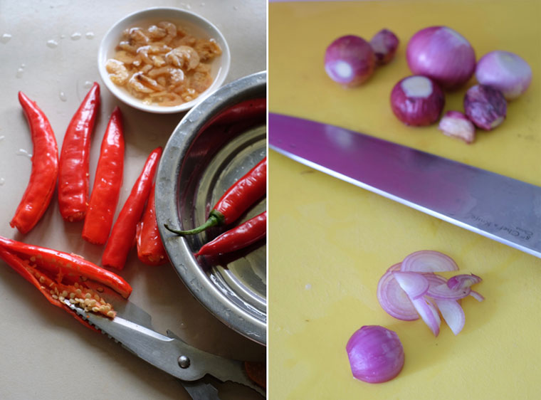 PREP: Soak dried prawns, drain, and chop into small pieces. Peel and slice shallots into rings, then place into a bowl.Toast belacan and put in the blender. Wash, deseed, and cut fresh chillies into the blender.