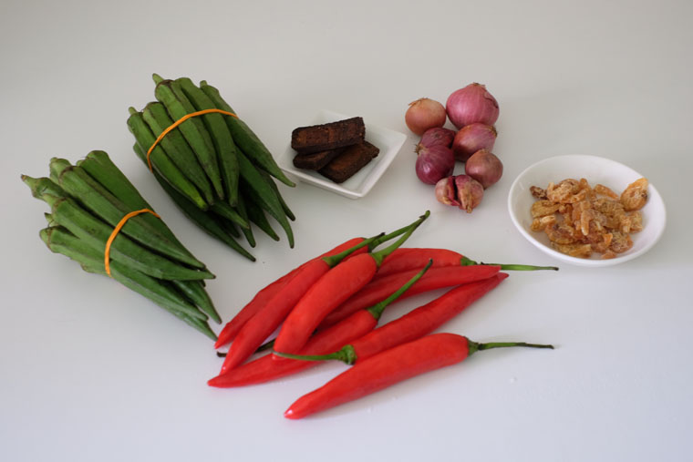 Blend 8 deseeded red chillies + 15 g toasted belacan to make sambal belacan. Dry roast sambal belacan and 2 tbsp dried prawns. Mix: sambal belacan + dried prawns + 8 sliced shallots + 1 tsp soy sauce + 1/2 tbsp sugar + juice of 1 lime. Blanch 300 g okra. Pour sambal paste over okra.