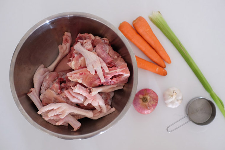 The basic idea is to boil animal bones (e.g chicken) long enough that it sets up as solid gel if you put in the fridge. That is the mark of a collagen-rich broth. You need to use the right bones – those with a lot of cartilage. For chicken, do include the backs, wings, necks and feet.