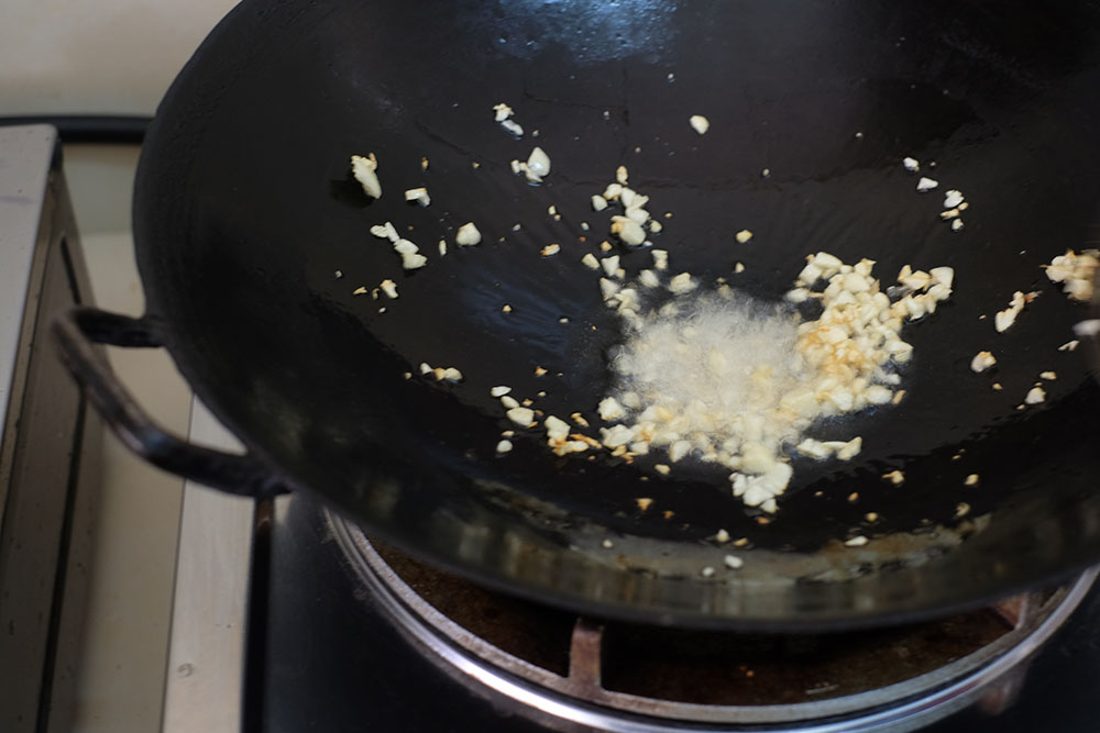 • Step 4 FRY GARLIC: When the wok is dry, pour in oil and garlic into a wok. On medium heat, fry garlic until golden brown.