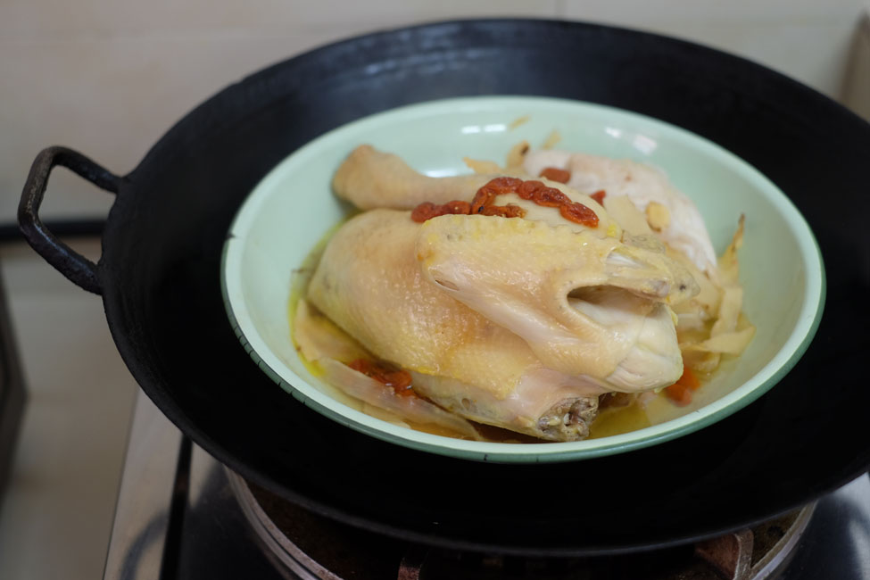 - Step 3 STEAM CHICKEN: Put a steaming rack and two bowls of water into the wok. Turn on the heat. When water boils, put the plate of chicken in. Cover and steam on medium fire for 15 - 20 minutes until chicken is cooked. Add 2 tablespoon of chinese rice wine (optional)