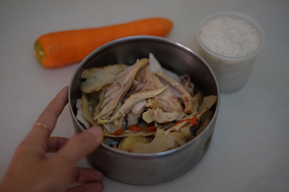 - Step 2 COOK CONGEE: Put washed rice, carrot, leftover chicken, and water into the rice cooker.