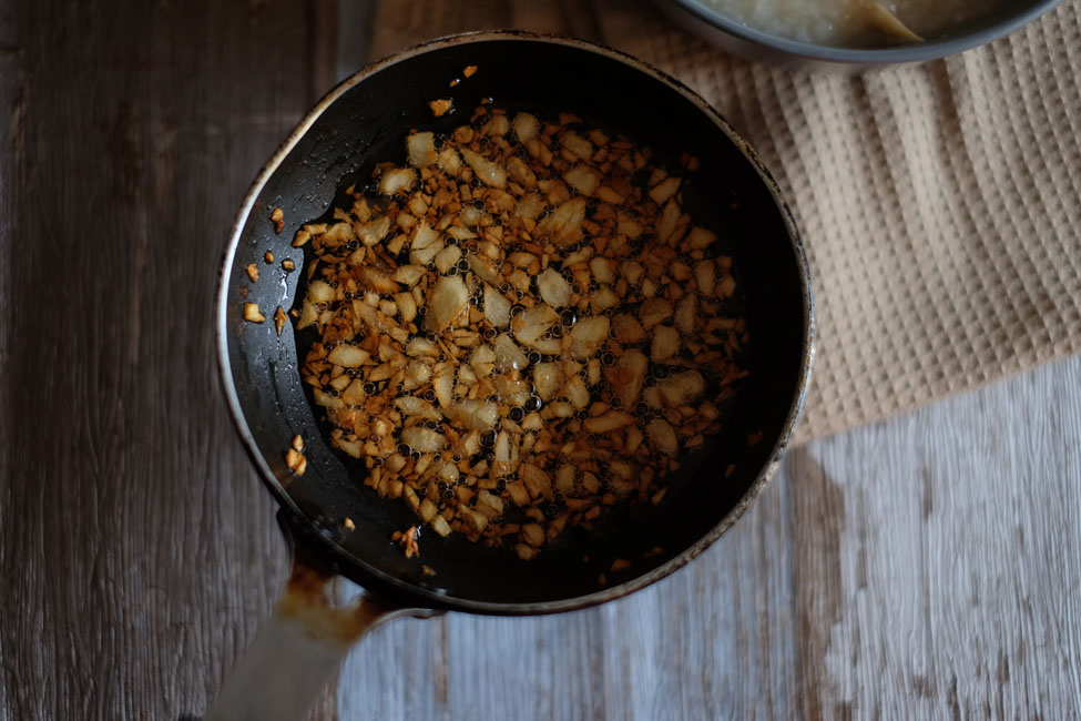 - Eat it together with some fried garlic We are trying to eat as much superfoods as we can. Garlic is one of them. You can make garlic oil and pour it over. Make it in a microwave in just 5 minutes! I like to do it in a small egg pan (Don't let is turn brown like this. I was busy taking the shot and quickly poured it out to stop it from turning black and bitter)