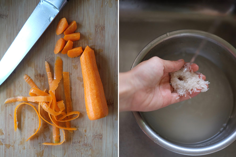 - Step 1 WASH RICE & CHOP CARROTS: Wash rice until water is clear. Peel and chop carrots.