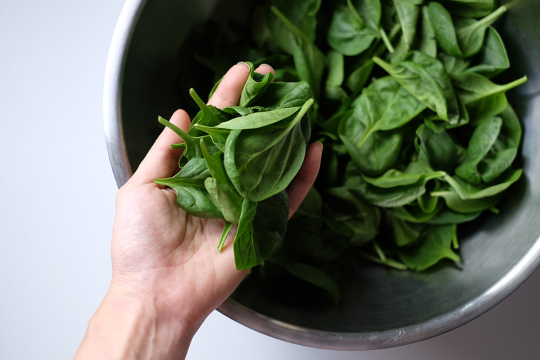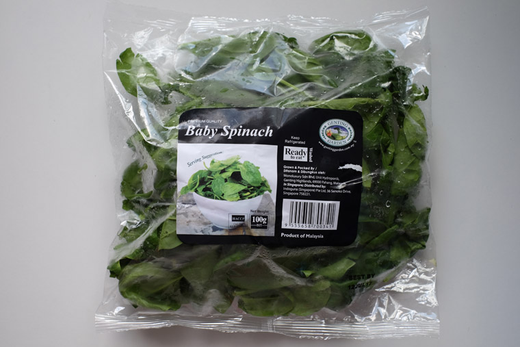 - Buy organic baby spinach. The original recipe uses regular spinach which comes in a bundle. After squeezing the excess water, it’s then chopped into 1.5 inches long. But for convenience, I buy a packet of organic baby spinach instead. Each packet is 100g – the exact amount of this recipe. Not only do I not have to wash the vegetables throughly, I don’t have to chop it either.
