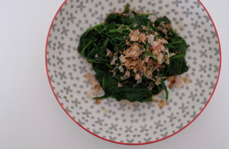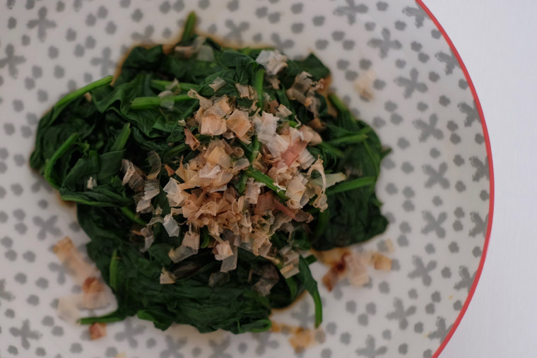 Boil 100 g of baby spinach for 2 min. Squeeze excess water. Arrange on plate. Pour 1/2 tbsp dashi stock + 1/2 tbsp soy sauce. Top with bonito flakes.