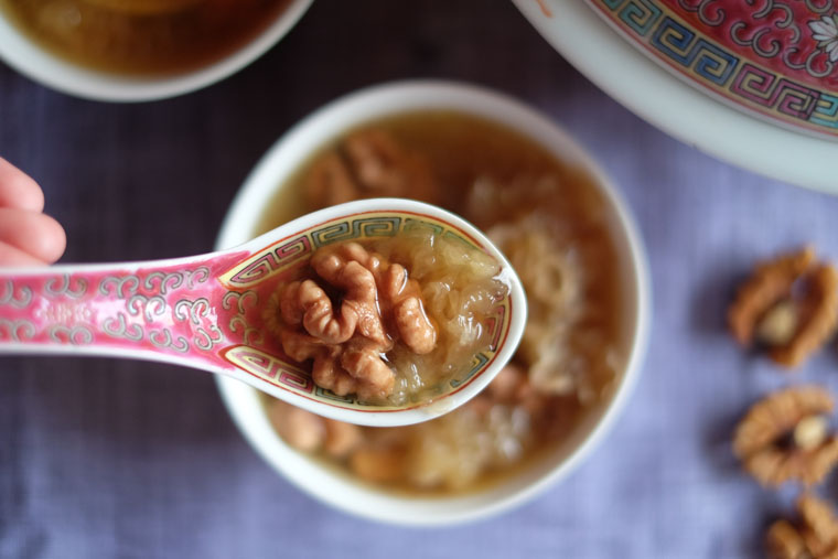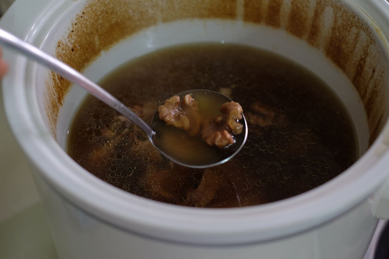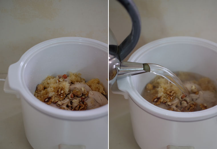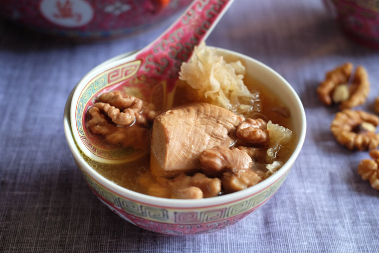 Blanch 750 g chicken bones and meat. Rinse herbs (24 g walnuts + 8 g snow fungus + 1 honey date + 4 pcs dried figs + 24 g lotus seed + 8 g lily bulbs + 6 g princspeia uniflora). Boil chicken + herbs + 2 L water in a slow-cooker for 4 - 6 hrs. Season with sea salt.