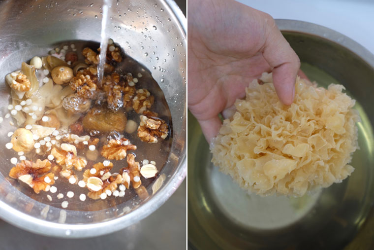 1. PREP: Rinse herbs in a bowl of water. Soak snow fungus.