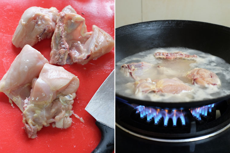 - Step 2 BLANCH CHICKEN: Place chicken into a wok. Fill in with water until chicken is fully submerged. Turn on stove on high heat. Let it blanch (5 mins). Rinse chicken.