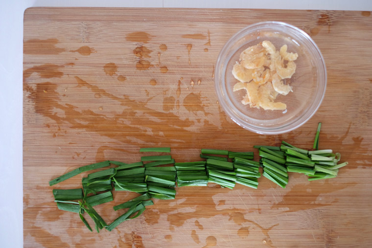 You need only these 3 main ingredients: flour, chives, and dried shrimps. The rest – oil, sugar, and alt – should be found in every cook’s pantry.