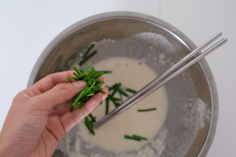 - Step 2 MAKE BATTER: Slowly add water into the flour while using a pair of chopstick to mix into a smooth paste. Season with sugar and salt. Add chives. Mix well.