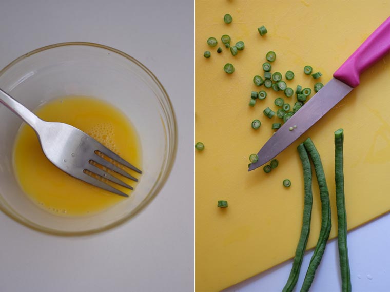 1. PREP: Beat egg. Slice long beans. Roll and thinly slice kaffir lime leaves (if using).