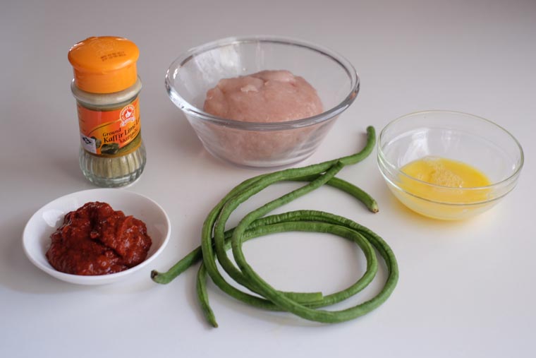 - Step 2 COMBINE INGREDIENTS: In a large bowl, combine fish paste, egg, chili paste, and kaffir lime leaves powder/leaves and mix with a pair of wet chopsticks until a smooth paste if formed. Add long beans and mix well.