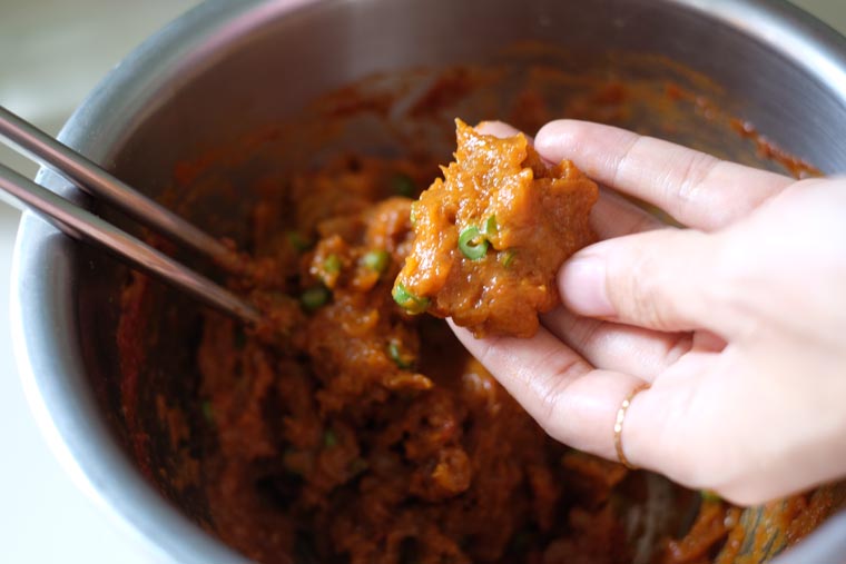 3. SHAPE: Wet your hands and shape fish paste into round patties.