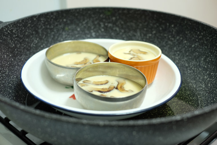 - Step 7 ADD MUSHROOMS & EGG INTO BOWLS: Place a few slices of mushroom into each cup. then, slowly pour in the egg mixture. Top each bowls with coriander leaves, if any.