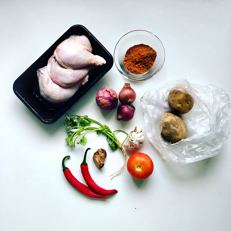 Blend: 5 red onions + 10 cloves garlic + 1 inch ginger + 2 red chili + 1 sprig coriander + 1 tomato + 2 tbsp curry powder + 1.5 tbsp coriander powder + 1.5 tbsp cumin powder. Cook paste in 1/2 cup of oil for 10-15min. Add 2 chopped chicken thigh + 2 peeled potatoes + 2 cups of water. Cover and cook for 15 minutes. Flavour with 2 tbsp coconut powder + 1.5 tsp salt.