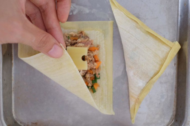 • Step 2 TO WRAP WONTONS: Fill wonton skins with a teaspoon of filling each and a small cube of cheese. Wrap into half and secure wonton skin with a little water.
