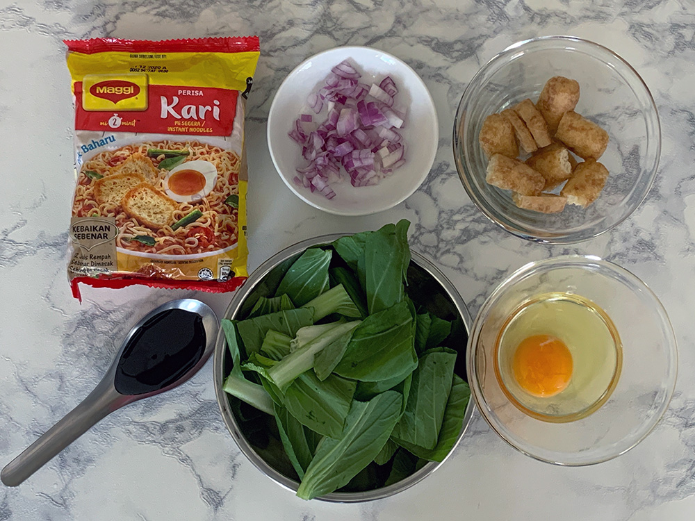 On top of  packet of curry flavour Maggi noodles and cooking oil, you only need to prepare 5 essential ingredients: onions, tofu, vegetables, egg, and dark soy sauce.