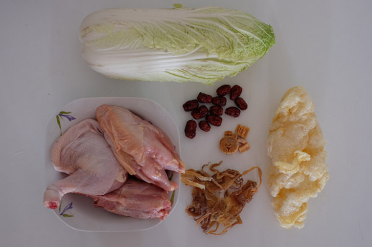 Bring to a boil 1.5 L water + 10 red dates + 3 scallops + 1 ps dried cuttlefish + 600 g chopped cabbage. Simmer for 3 hours. Add 30 g soaked fish maw 10 minutes before serving. Season with salt.