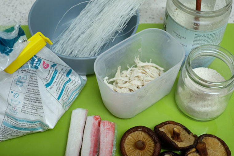 - Step 1 PREP: Boil chicken breast for about 5 minutes. Soak glass noodles and shiitake mushroom. Shred crabsticks and chicken into thin slices. Slice mushroom into thin slices. Dilute cornflour in water.