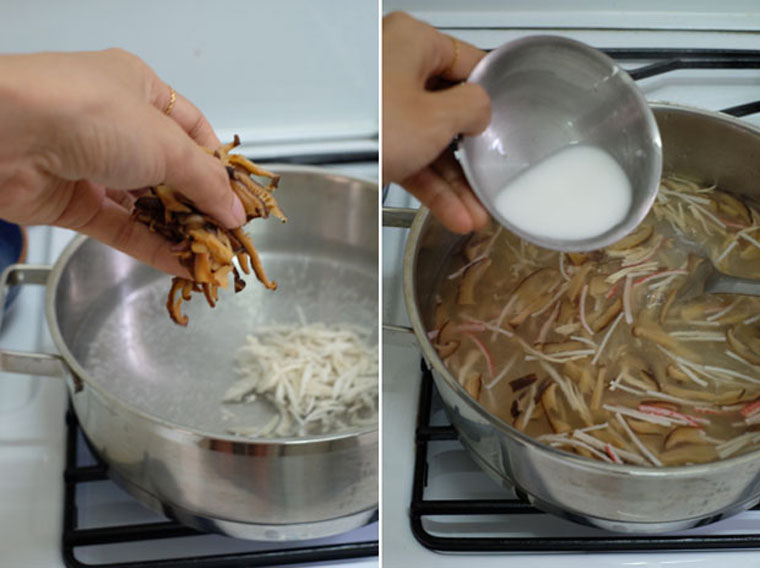 Boil sliced mushroom & shredded chicken. Add glass noodles & crabsticks. Season with 1/8 tsp dark soy sauce + 1 tsp salt + 1 tsp chicken stock. Thicken with 4 tbsp cornflour diluted in 4 tbsp water. Pour whisked egg and stir. Serve with black vinegar.
