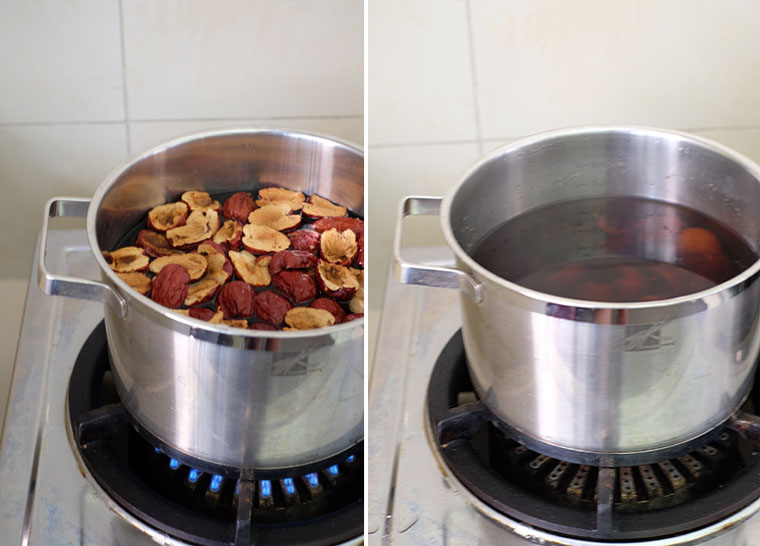The above photos is boiled only for 1.5 hours. You can tell from the colour and viscosity of the drink. Slow-cooked red dates drink is deeper in colour, thicker, and pleasantly sweeter than normal.