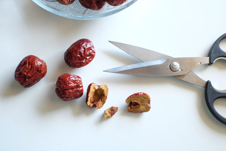 - Slice red dates To extract maximum flavour, cut the dates into half. I like to use a pair of sharp scissors to do so ( it’s much easier!)